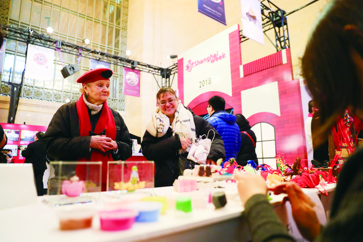 当地时间1月10日,在美国纽约大中央车站,人们参观“上海印象”非遗展。当日,“上海印象”非遗展和“魅力上海”图片展亮相纽约大中央车站。“欢乐春节·上海文化周”系列活动9日至12日在纽约举行,包括上海电影周、上海电视展映周、“上海印象”非遗展、“魅力上海”图片展、音乐剧场《霸王》以及上海大学生中华优秀传统文化海外展演活动。