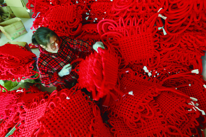 1月11日,在山东省临沂市郯城县红花镇一家工艺品厂,工人在整理中国结。春节临近,山东临沂、枣庄等地的节庆饰品车间、手工艺人开始忙碌起来,人们加紧制作各种春节饰品,供应市场。