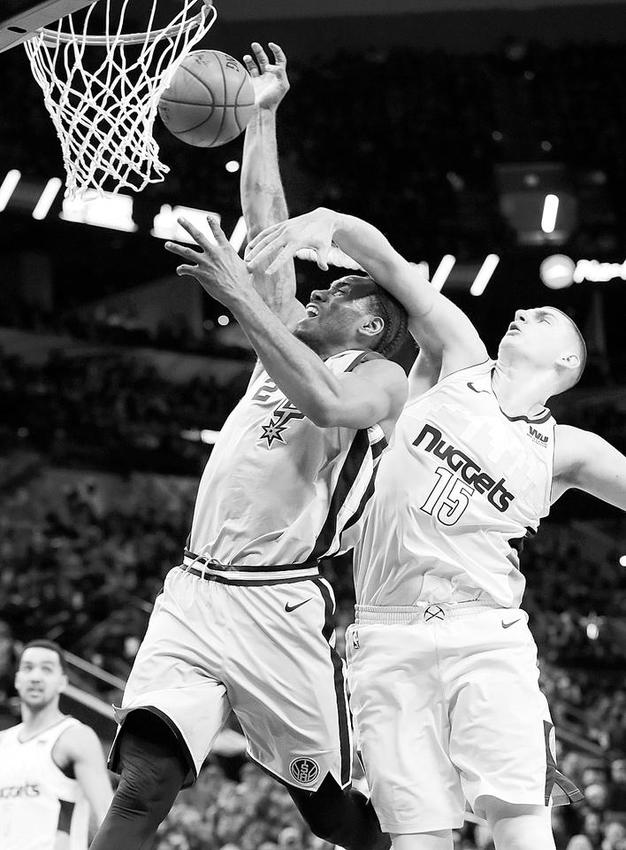 1月13日,马刺队球员莱昂纳德(右)在比赛中遭到掘金队球员约基奇的犯规。