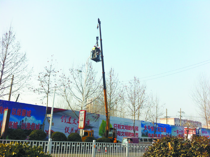 为方便市民出行,1月15日9时许,几位工作人员在周口中心城区庆丰路上更换不亮的路灯。记者 张洪涛 摄