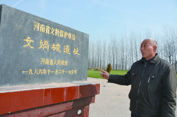 出女娲城景区向东行几百米后,映入眼帘的是一片空旷麦田,若不是向导说这里就是女娲古城遗址,记者还真看不出它和普通麦田有什么两样。走近它,一块石刻碑很快映入眼帘,正面写着“河南省重点文物保护单位”字样,背面刻着“女娲城遗址”字样及其简要介绍。“上世纪80年代初,村民在此取土打坯建房,经常挖出瓦当、子母砖等物件,还有村民挖出写着‘娲’字的古城砖。现在,这块‘娲’字古城砖存放在市博物馆内。经文物部门考证,认定这里是春秋时期复修的女娲城遗址。”曾任思都岗村党支部书记的李德良说。从碑刻的位置向西看,记者发现麦田里有一道明显凸起的土埂,李德良指着那里说:“那就是女娲古城的西城墙,老辈人说当时女娲古城有高高的城墙,还有寨海子、护城河,城中极尽繁华。”
