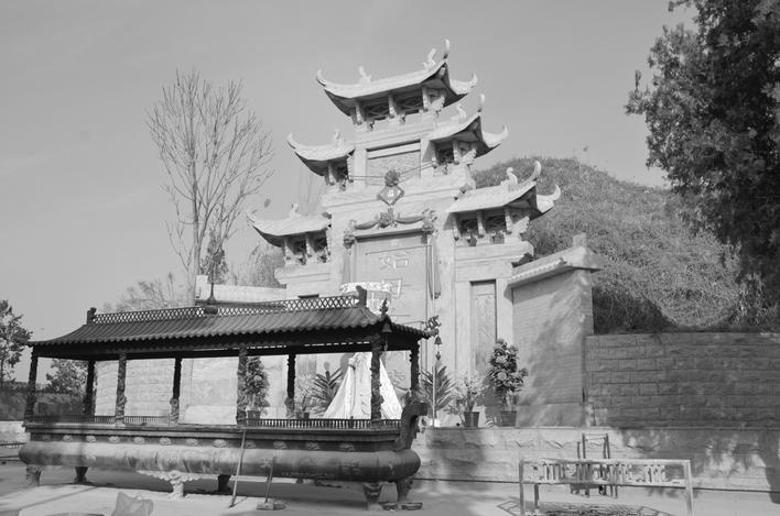 这个冬至不太冷,上午9点多钟的太阳晒在身上暖洋洋的。站在盘古女娲创世广场向女娲城景区入口望去,山门前两棵柏树焕发着勃勃生机,青翠的绿直逼人眼。高高的山门以蓝绿色调为主,阳光洒在金黄色的琉璃瓦上折射出耀眼的光芒,瓦片的缝隙中几株不知名的野草随风摇曳,给这座只有数十年历史的山门平添了几分沧桑。踏进山门西行,高约6米的女娲陵立刻出现在记者面前,高大的石碑上书“始母女娲陵”字样,一座据说是周口香客捐赠的、长约9米的焚香炉安静地横立在女娲陵前的空地上,接纳来自四面八方的香火。沿着圆形的陵墓环行,干净的水磨石台阶上看不到任何杂物。在西侧墙边记者发现两块碑,一块青石碑,一块木刻碑。其中,木刻碑上写着“始祖盘古之尊位、始母女娲之尊位”,中间部位浮雕着盘古女娲创世造人的形象。