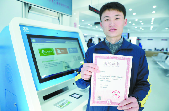 1月15日,江苏大学一名大学生展示通过自助设备帮同学办理的三好学生荣誉证书。当日,江苏大学“一站式”学生事务与发展中心正式开张运行,该校所有与学生相关的证件补办、就业派遣、档案转接、户籍迁转、留学服务等近百项事务均可在中心“一站式”办理,为学生提供了极大便利。