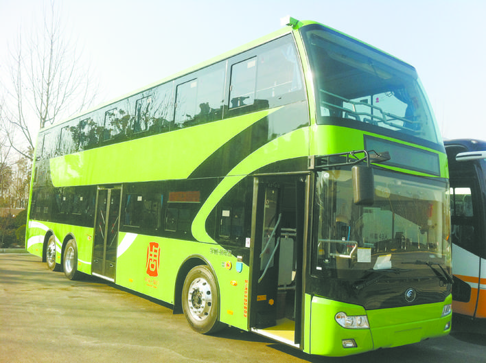 这种纯电动双层巴士的车身以绿色为主色调,中间有两条白色波纹,在上车门附近印有“中国周口”和周口市标(如图)。在第一层,车内地板用红色仿桃木纹地板革制成,座椅、护栏、扶手等设施一应俱全。