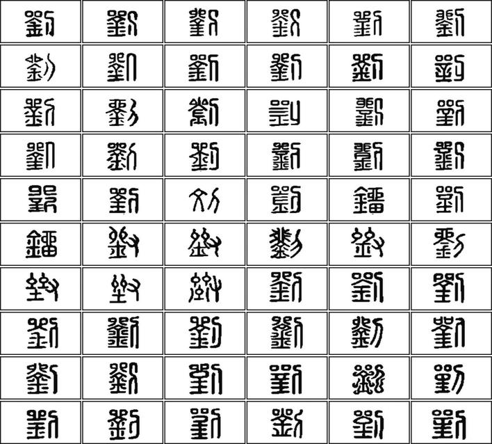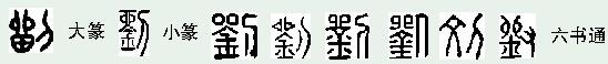 “刘”,繁体为“劉”,会意字,从卯,从金,从刀。“卯”,表示剖分;“金”,表示金属;“刀”,表示兵器。简化“刘”字从文,从刀。甲骨文的“文”字,是人的象形,身上画有纹络,是“纹”的本字,指交错的纹印。以刀施加于人,割画出纹印,故“刘”有杀戮、屠戮之意。古代大部分北方地区,把“杀”称为“刘”。《尚书·盘庚上》:“重我民,无尽刘。”意为重视民众,不让民众受杀戮。