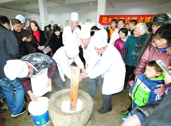 1月21日,在浙江省绍兴市上虞区丰惠镇西湖村文化礼堂,年糕师傅在石臼里手工打年糕。当日,浙江省绍兴市上虞区丰惠镇举行迎新春民俗活动,打起热腾腾的年糕迎接新春。