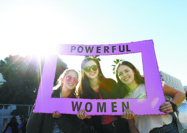 当地时间1月20日,人们在美国洛杉矶市政厅前参加妇女大游行。 在美国特朗普政府执政一周年之际,美国各地20日举行妇女大游行,呼吁实现男女平等,表达对保障妇女、移民及其他弱势群体权益的支持。