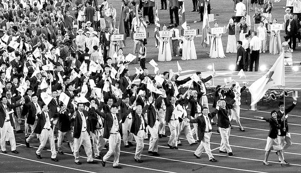 这是2003年8月21日,朝鲜和韩国代表团在大邱第22届世界大学生运动会开幕式上携手入场。