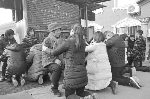 手语舞《跪羊图》表演结束后,13名老人在主持人的搀扶下走上舞台,分成两排坐下。13名被当地评为“好媳妇”“好儿子”的村民走上前来向父母深深鞠躬后,“扑通”一声跪在父母脚下,紧紧地握住父母的手,仔细端详着父母脸上的皱纹,为父母整理衣服(如图)。“父母不在乎你们官当多大、钱有多少,只在乎你们的平安,只在乎你们的一个电话、一声问候……”主持人饱含深情,歌曲《白发亲娘》渐起。“好儿子”刘绍行看着母亲长满老茧、像树皮一样的双手,一句“妈,这些年您受累了”让64岁的母亲梁爱荣泪流满面。