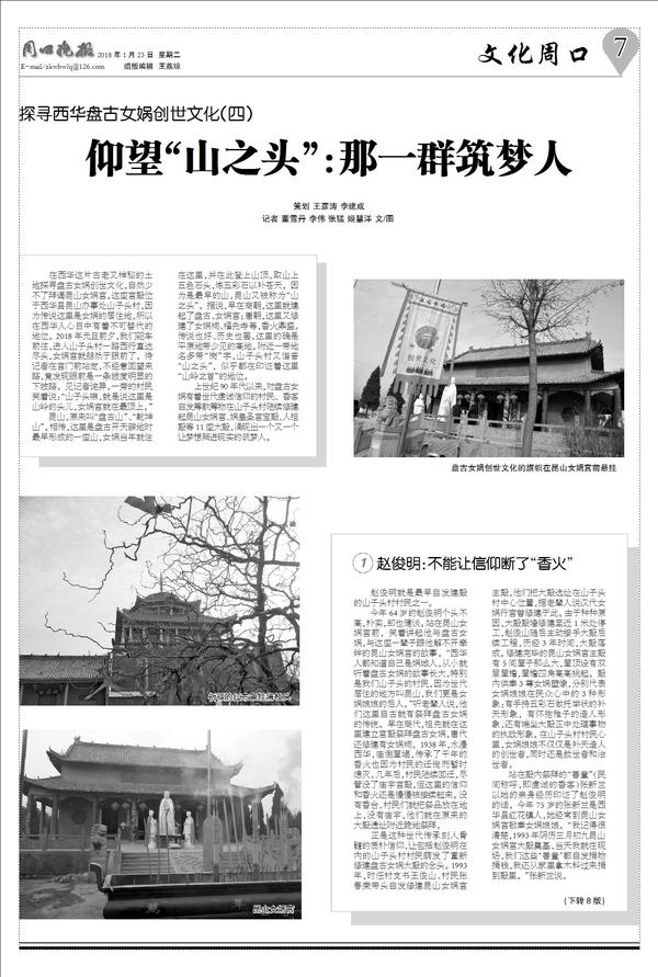 上世纪90年代以来,对盘古女娲有着世代虔诚信仰的村民、香客自发筹款筹物在山子头村陆续修建起昆山女娲宫、娲皇圣宫宝殿、人祖殿等11座大殿,涌现出一个又一个让梦想照进现实的筑梦人。