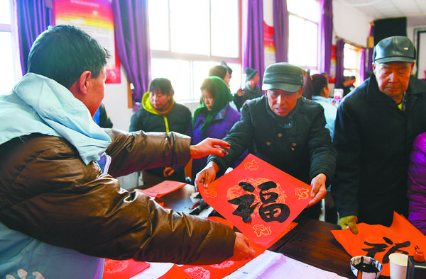 1月23日,慈母川村村民在领取福字。当日,位于燕山山脉深处的北京市延庆区大庄科乡慈母川村举行腊八节文化活动,村委会为村民熬制腊八粥,文化宣传队为村民送上文艺演出,书法爱好者为村民书写春联,小山村充满了浓浓的年味。