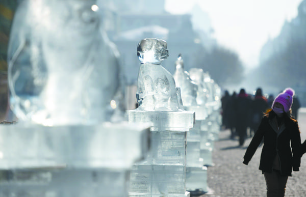 1月24日,游客从冰雕景观旁经过。连日来,冰城哈尔滨市遭遇“极寒”天气,最低气温达到零下35摄氏度,许多市民、游客从头到脚“全副武装”出行。