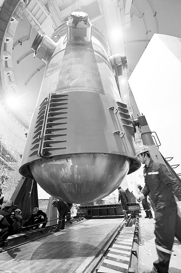 1月28日17时左右,“华龙一号”全球首堆、中核集团福清核电5号机组反应堆压力容器顺利吊装入堆。该设备是我国首个具有完全自主知识产权的三代核电工程压力容器,此次顺利吊装将为“华龙一号”机组的后续安装工作开展创造良好条件。图为福清核电5号机组反应堆压力容器抱环拆解现场(1月28日摄)。 新华社记者 林善传 摄