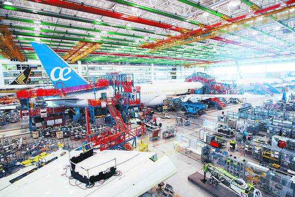 当地时间1月26日,在位于美国南卡罗莱纳州北查尔斯顿的波音南卡罗莱纳工厂,工人在787客机总装车间内工作。 波音南卡罗莱纳工厂目前有约7000名员工,生产787-8、787-9和最新的787-10等“梦想”全系列机型,是第二条787梦想飞机总装线所在地。目前,已有超过100架波音787系列飞机在这里交付。 新华社记者 王迎 摄