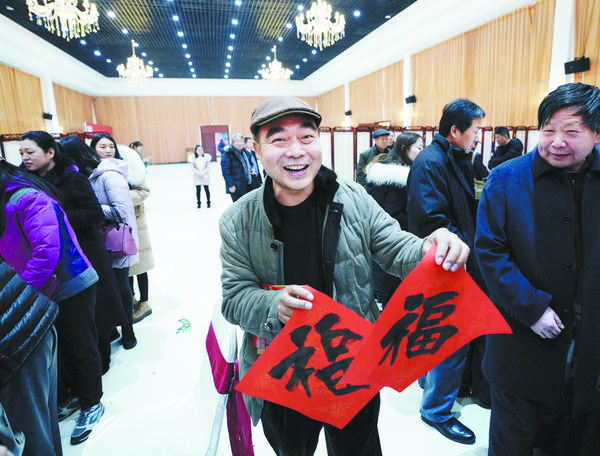 1月30日,河北保定的书法爱好者董建彬获得由北京书法家写的福字。当日,中共保定市徐水区委宣传部组织书法家,为当地居民写春联,送祝福,迎接新春,送文化到基层。 新华社记者 邢广利 摄