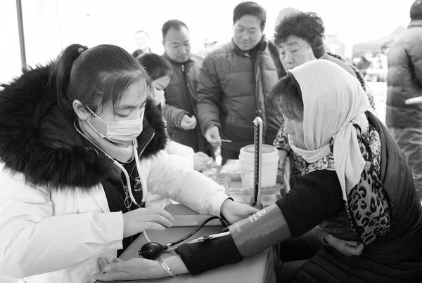 1月31日,合肥市凌大塘社区志愿者在为外来务工人员体检。当日,安徽合肥市凌大塘社区在凌大塘临工集散中心举办迎新春“临工文化节”,通过开展文化演出、公益服务等活动,让外来务工人员在春节返乡前感受温暖。 新华社记者 刘军喜 摄