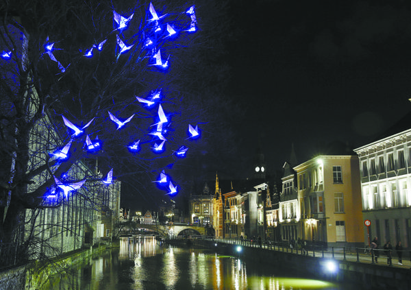这是当地时间1月31日在比利时根特灯光节上拍摄的灯光作品。