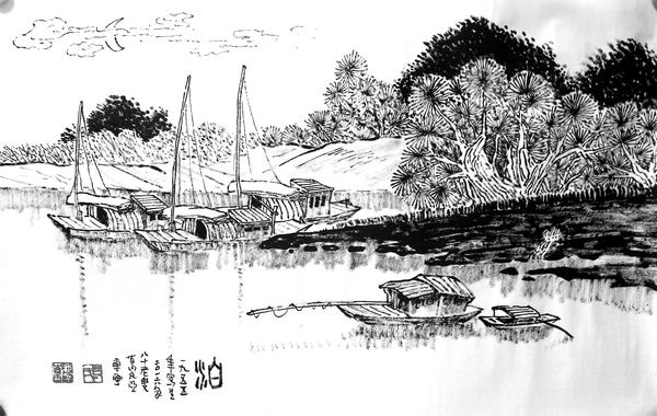 □葛庆亚 文/图 绿树金沙水一湾, 风轻浪静好停船。 今夜养息好, 明晨早扬帆。 1955年写生