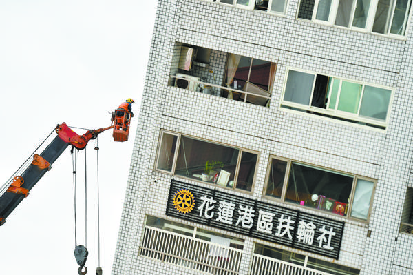 新华社驻台记者7日搭乘早班火车抵达花莲。在地震现场,记者看到云门翠堤大楼倾斜约45度,救援人员正在用钢架支撑大楼防止进一步倾斜,以便救援人员进楼检查。