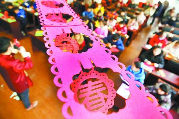 2月7日,孩子们在学习剪纸。当日,江苏南通新城桥街道开展“剪纸送春意”活动,数十名孩子在剪纸艺人的指导下围绕春节主题剪出各类造型的作品,在浓浓的节日氛围里感受传统文化的魅力。