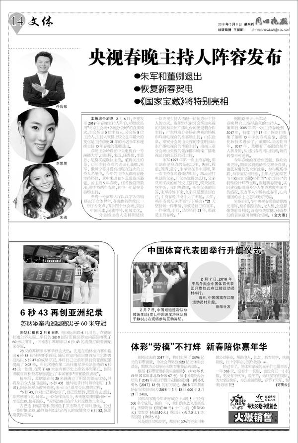 本报综合消息 2月6日,央视发布2018年春晚主持人阵容,将继续沿用“北京主会场+各地分会场”的直播模式,主会场设5位主持人,分会场8位主持人,主持人安排上较之往年最大的变化是主持春晚21年的元老朱军和连续主持13年春晚的董卿退出。