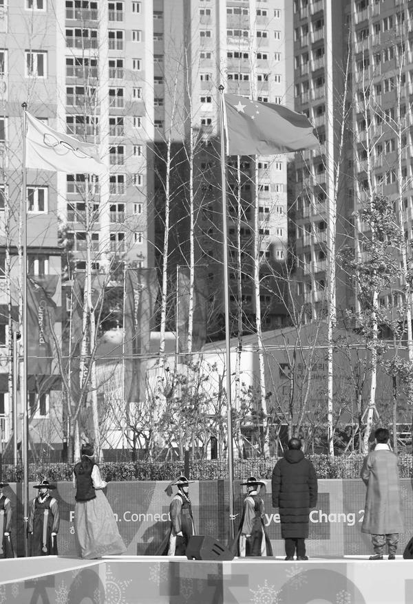 2月7日,2018年平昌冬奥会中国体育代表团升旗仪式在江陵运动员村举行。