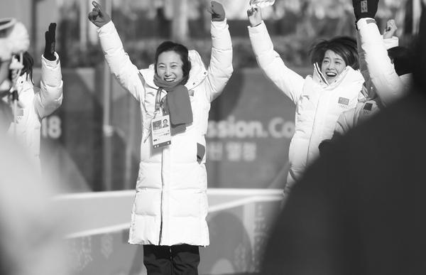 2月7日,中国短道速滑队总教练李琰(左)、中国速度滑冰队员于静(右)在现场参与互动舞蹈。