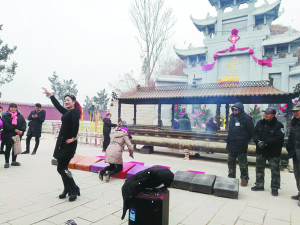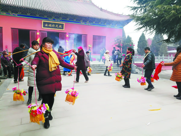 耿宝山所说的“历久弥新”很容易就在记者采访当天得到了证明:3支经挑舞队伍在女娲城里往来穿梭,不仅表演内容多样、富于创新,还都用上了现代化音响设备。除了经挑舞,女娲陵前还有竹马旱船表演、坠子书表演、经歌表演等,都与盘古女娲传说相关,引人入胜。