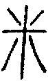 “米”字的甲骨文写作 。字中的六点,代表米粒的象形。字中的一横,有学者认为代表粮食放置的间隔;有学者认为以一横将米与沙粒、水滴相区别;有学者认为“一”表示将米粒连结在一起的意思。后来中间一横逐渐被“十”字代替,表示米粒四周散放、纵横琐碎之状。“米”的本义为去皮后的粮食作物的子实,后多指稻米。《说文》:“米,粟实也。象禾实之形。”