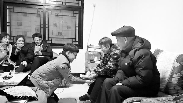 吃过年夜饭,给长辈叩头拜年是“重头戏”。两个儿子利索地将餐桌收拾干净,把赵爱芝和老伴请到沙发上就坐。大儿子马东雷端端正正地跪在老人面前说:“爸,妈,祝二老新年快乐,平安健康!”说完,恭恭敬敬地叩了仨头后站了起来,赵爱芝和老伴把早已准备好的压岁钱放在大儿子手里,慈祥地笑着。随后是孩子们,伴随着一声声“爷爷奶奶福如东海、万事如意、心想事成”的祝福语,赵爱芝手中的压岁钱都发了出去,屋子里充满了欢笑声。