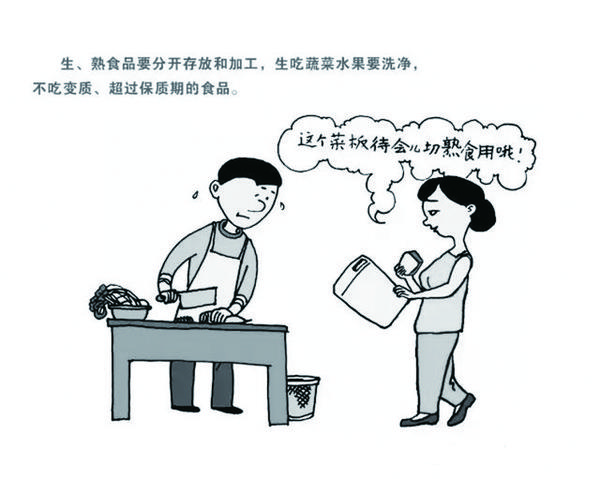 生、熟食品要分开存放和加工,生吃蔬菜水果要洗净,不吃变质、超过保质期的食品。