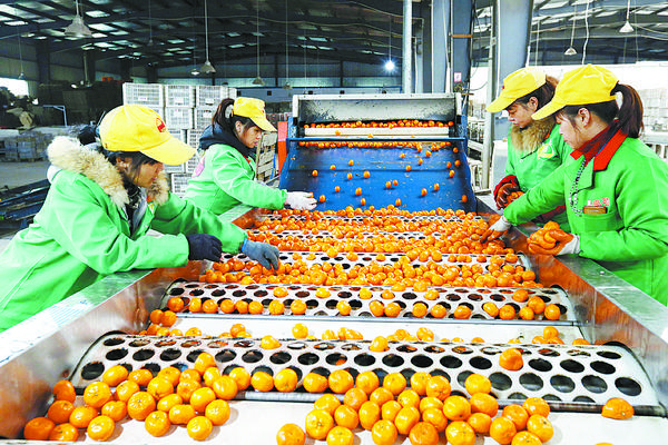 2月22日,江西省南丰县一家果业公司的工人在流水线上忙碌。 当日是春节假期结束后的第一个工作日,企业纷纷复工生产,力争新春开门红。
