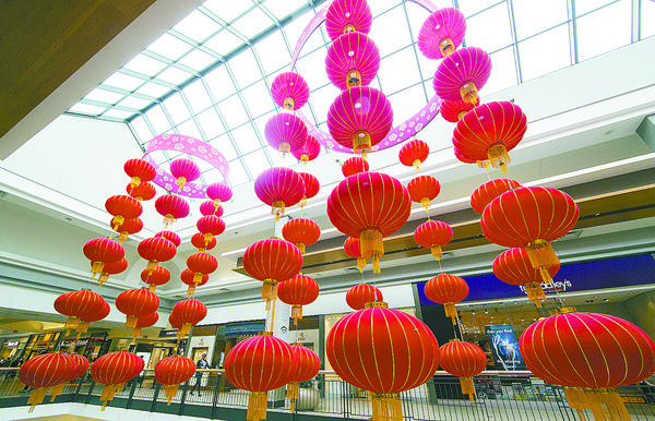 加拿大多伦多的费尔维尤购物广场内挂着中国灯笼(2月21日摄)。为庆祝中国农历狗年春节,多伦多的许多商店、超市及城市广场推出以春节为主题的装饰及宣传,过年气氛浓郁。