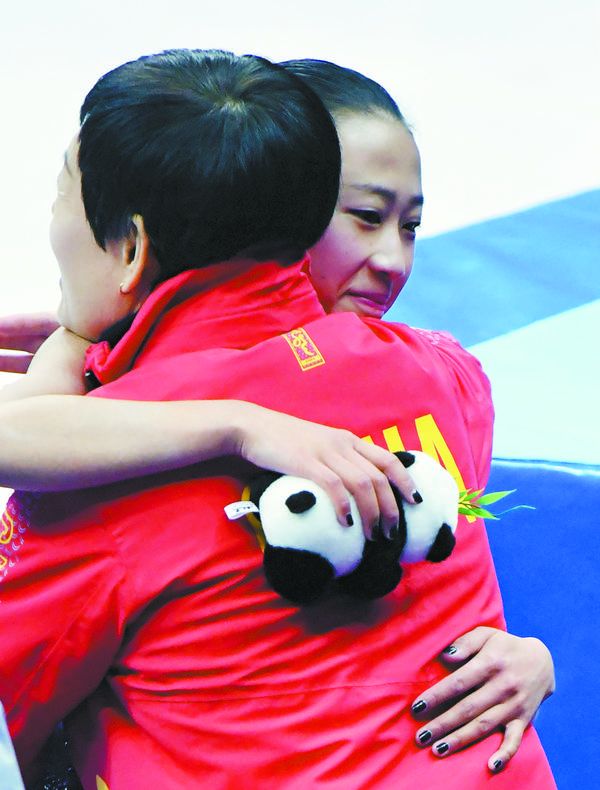当日,中国选手李香凝(左)在比赛后拥抱教练。