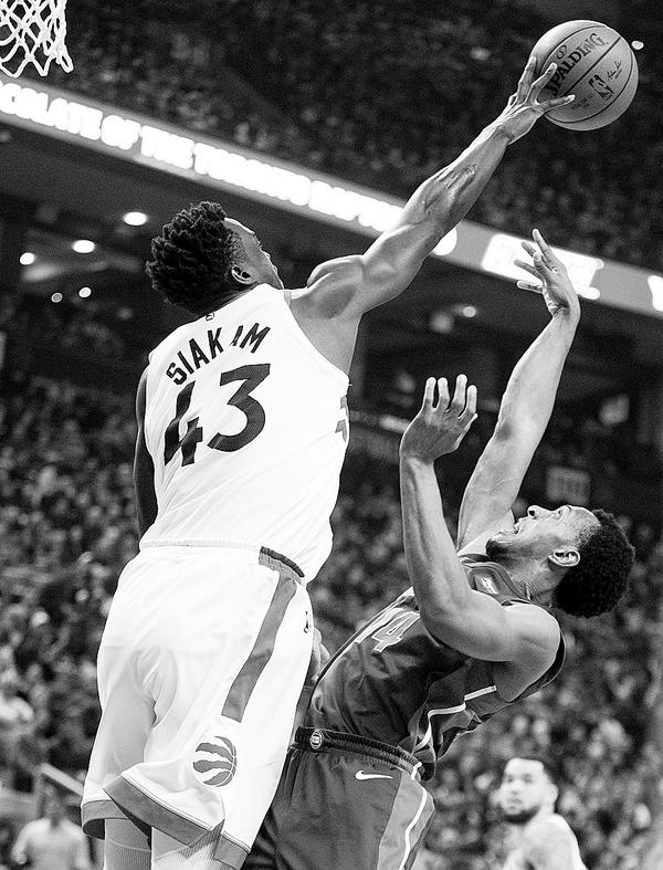 当日,猛龙队球员帕斯卡尔·西亚卡姆(左)在比赛中封盖活塞队球员史密斯上篮。