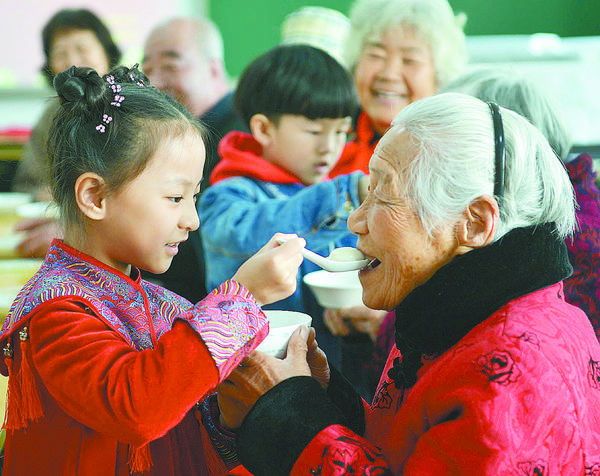 3月1日,在河北省石家庄市海天阳光园社区举行的欢庆元宵节活动中,6岁的康铭轩小朋友请李梅顺老奶奶品尝元宵。
