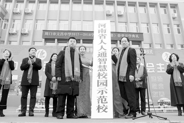 3月3日,在周口市文昌中学春季开学典礼上,教育部教育管理信息中心、教育信息化专委会项目主任罗志刚为该校揭开了我省首所“人人通智慧校园示范校”的牌匾,标志着该校“智慧校园”建设迎来了新的春天。 记者 刘华志 摄