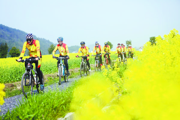 3月3日,自行车爱好者在湖南省衡阳县库宗桥镇的油菜花海里骑行。近日,衡阳县大面积油菜花绽放,吸引游客前往赏花休闲。 新华社发