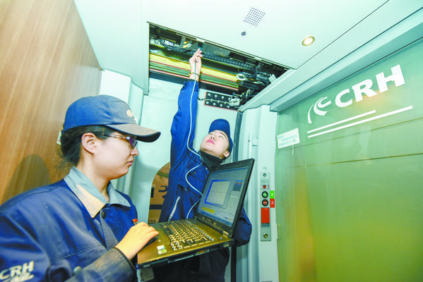 合肥南动车运用所内,女子车门维修组组员陈璇(右)和荣蓉在进行动车组车门电流测量作业(3月6日摄)。在南京动车段合肥南动车运用所,有一个由5名女职工组成的作业小组,专门负责动车列车的车门安全检查,被形象地称为动车组的美丽“女门神”。女职工们在工作中细致耐心,吃苦耐劳,为动车组安全出行保驾护航。新华社记者 郭晨 摄