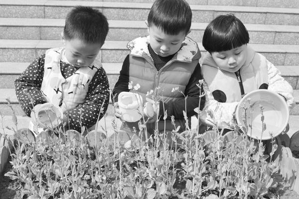 图为该幼儿园的孩子在种植园里为花草浇水。