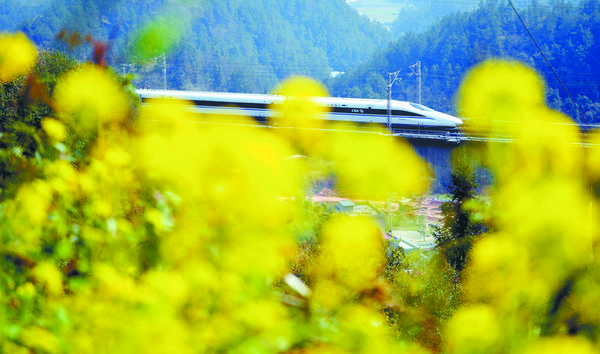 3月11日,在湖北省恩施土家族苗族自治州建始县境内,一列动车行驶在宜万铁路上。