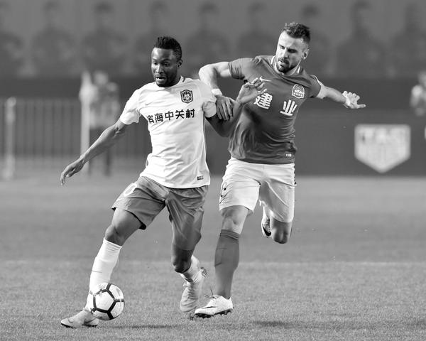 当日,天津泰达队球员米克尔(左)与河南建业队球员奥兰多萨在比赛中拼抢。新华社 发