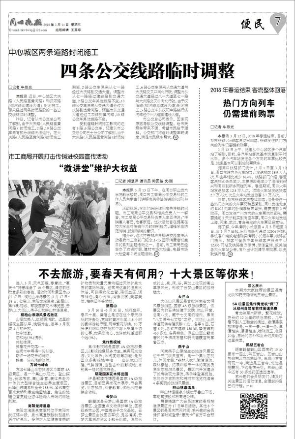 进入3月,天气回暖、春意浓,“惠民卡”特意准备了10个景区,请您前往欣赏多彩的春色。活动时间和景区为:3月17日,桐柏山淮源景区;3月17日~18日,七峰山、南阳龙湾温泉、黛眉山、焦作影视城、鄢陵国家花木博览园、云梦山、大伾山、燕子山和畔山林语温泉。