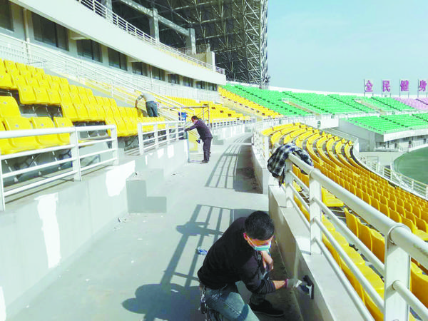 本报讯 今年9月,省十三运会开幕式将在市体育中心体育场举行。3月13日,记者在市体育中心体育场看到,这里正在进行改造升级,工人们正在粉刷场馆内外墙(如图)。