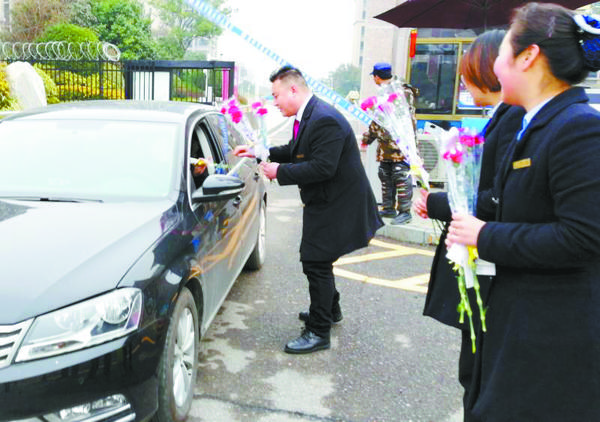 “三八”妇女节一大早,碧桂园物业周口分公司项目经理王永亮带领工作人员来到碧桂园小区门口,为该小区的女业主送去节日的祝福。