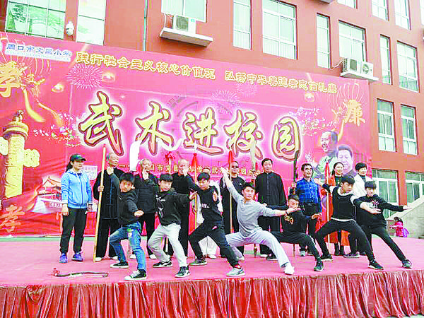 本报讯 为弘扬中国传统武术,促进学生安全教育,3月14日下午,传统武术进校园启动仪式在周口市文昌小学举行。
