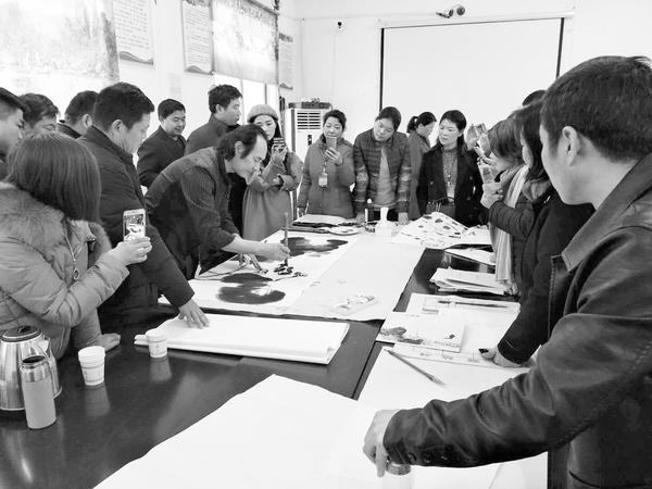 3月17日9时,3位中国文联文艺志愿者一下车就开展书画培训。张铜彦深入浅出地为大家讲解书法知识。马奔为参加培训的学员免费发放字帖、毛笔和毡子。之后,马奔又用多媒体现场传授书法技艺。刘殿卿为学员讲解国画、山水画的创作技巧,并现场为学员创作(如图)。