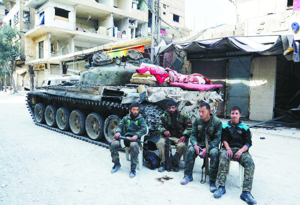 当地时间3月18日,叙利亚士兵在东古塔地区的萨格巴休息。东古塔地区是叙反政府武装在大马士革郊区的重要据点。近期,叙政府军和反政府武装在该地区的冲突升级。据叙军方消息,目前政府军已收复东古塔百分之八十土地。