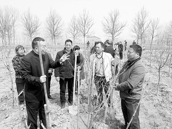 李士强(左前一)在李寨村苗木基地与种植户交谈