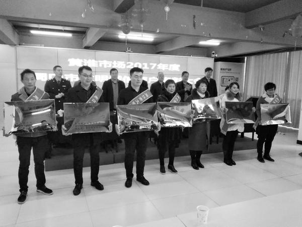 去年我市组织各类市场主体广泛开展争创“文明诚信商户”活动,记者近日获悉,全市183位商户获评2017年度周口市“文明诚信商户”称号。图为周口黄淮市场表彰该市场荣获2017年度周口市“文明诚信商户”称号的商户。记者 张洪涛 摄